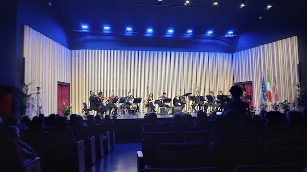 Poi il grande concerto, aperto dalle note dell’inno d’Italia suonate da docenti e allievi del liceo musicale, che ha scosso il petto e infiammato il cuore dei presenti. Poi gli allievi hanno ceduto il posto ai docenti, che hanno stupito tutti con un concerto dal programma delizioso: la musica volava come per magia sulle teste degli ascoltatori. Il valzer n. 2 di Shostakovich, li ha spinti a muoversi, quasi a ballare, mentre Habanera di Bizet gli è apparsa vibrante ed emozionante. Poi un pezzo evocativo composto da Angela Centola, docente di chitarra del Liceo Musicale: Zante, che ha cullato il pubblico sulle onde del “Greco mar” tanto caro al Foscolo. Poi non potevano certo mancare grandi classici delle colonne sonore come il Postino di Bacalov, il Nuovo cinema Paradiso di Morricone e La vita è bella di Piovani. E questo viaggio sulle ali della musica è terminato in Argentina, con la magia di Piazzolla, tra i più grandi virtuosi di bandoneòn e in prima fila tra i riformatori del tango. Prima di chiudere, non si possono non rivelare i nomi dei virtuosi che sono stati l’anima del concerto: alla chitarra Angela Centola e Niccolò Foppiano; al violino Nella Nero e Igor Congedo; alla viola Salvatore Casu; al violoncello Andrea Pecelli; al flauto Donatella Viscardi; al clarinetto Stefano Rapetti e Tommaso Perissinotto; al sax Luca Barchi; alla Fisarmonica Antonio Disabato; alle percussioni Francesco Ferrante; soprano Carmen D’Onofrio; al pianoforte Marina Boschi, Rosa Delisi e Renata Sacchi; attrice e presentatrice: Silvia Poletti. Il futuro del Gobetti è aperto: non resta che entrarci…