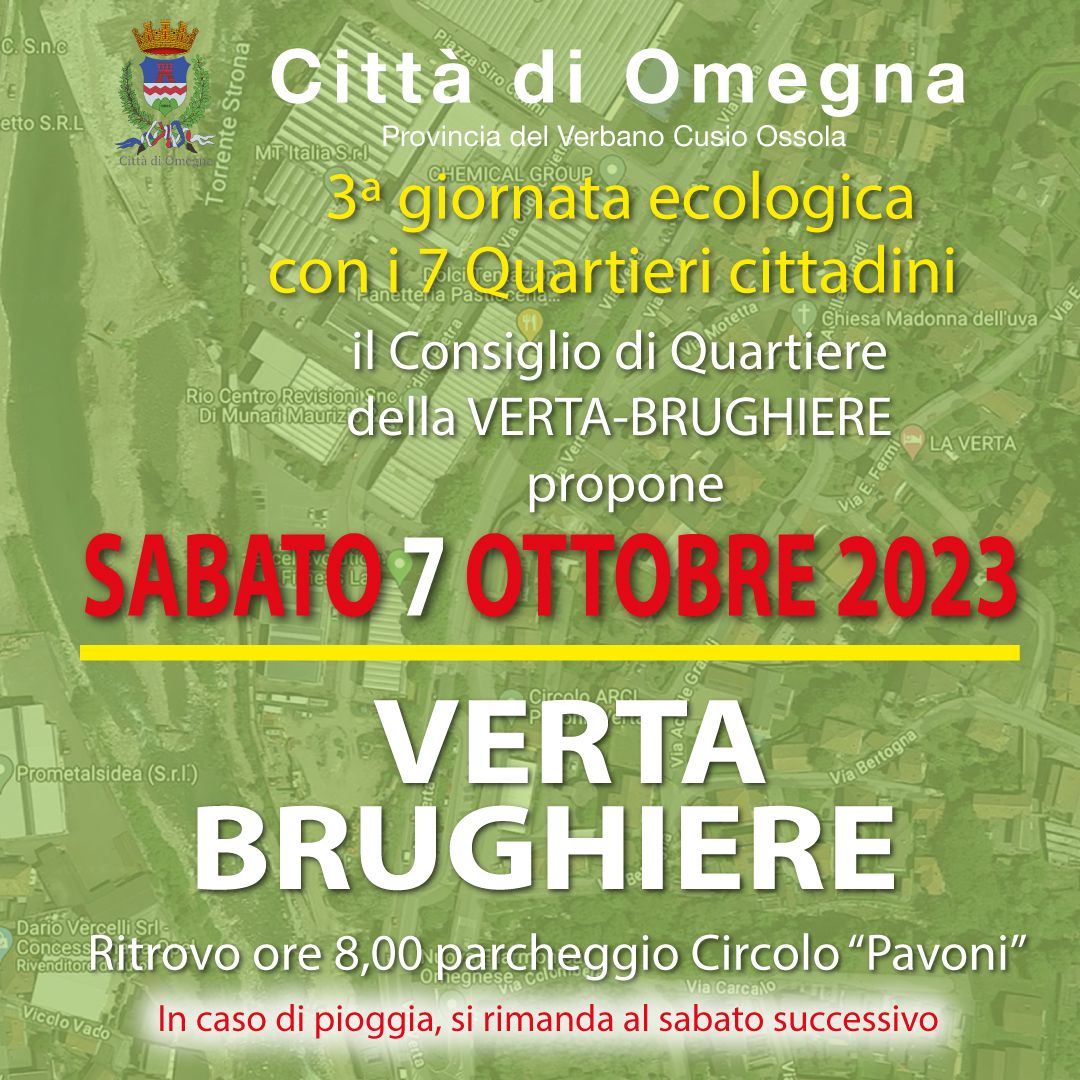 OMEGNA - 9-10-2023 -- La terza giornata ecologica omegnese, svoltasi sabato 7 ottobre alla Verta e Brughiere, ha visto la più ampia presenza di volontari sin qui registrata: una ventina di persone in rappresentanza dei Quartieri di Verta-Brughiere, Omegna Centro, Crusinallo, a cui si sono aggiunti sindaco e assessore ai quartieri.