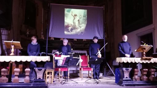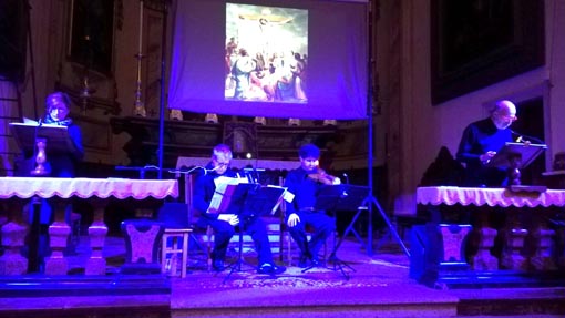 breve riflessione di don Giuliano Ruga, parroco di Pettenasco, a introdurre la Via Crucis che si è svolta venerdì, 12 aprile, nella Chiesa Parrocchiale di Pettenasco. Parole e musica per un emozionante momento di alta spiritualità e di profonda riflessione con il testo di Carlo Clemente, le musiche elaborate da Sergio Scappini, il violino di Giovanni Sardo, la fisarmonica digitale e la voce di Sergio Scappini e le voci recitanti di Patrizia Viscardi e Gianluca Binazzi.
