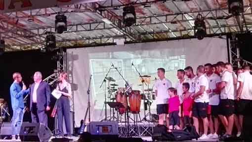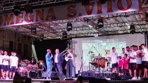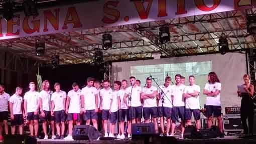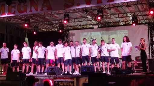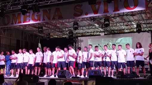 OMEGNA –03-09-2019 - San Vito si conclude con i colori rossoneri, i colori dell’Omegna Calcio, che si prepara a una stagione segnata da tanti ritorni. A presentare la serata, scoppiettante come i fuochi piromusicali di domenica, c’erano sul palco Andrea Calderoni e Marianna Morandi, affiancati dall’assessore allo sport Francesco Perrone, che ha sottolineato come nell’Omegna ci sia “una rosa rinnovata, con un presidente e dei consiglieri che vogliono dare lustro alla Società e alla città”. E dopo le oculate considerazioni espresse da Juri Carbone, responsabile del settore giovanile, si è passati all’under 19 – con l’intervento del responsabile della squadra, Valentino Alessi, che ha ricordato come si vive come un sogno, con la speranza che sia un sogno positivo. A far vibrare il pubblico con i colori della passione rossonera ci hanno pensato poi il mister Davide Martinelli e tutti i ragazzi della squadra. E, sulle parole dell’inno “La forza è nella tua gioventù”, sono stati svelati uno ad uno i loro nomi: Francesco Tornatora, Andrea Legnani, Simone Lomazzi, Luca Massara, Matteo Molinari, Manuel Sistino, Stefano Cerini, Lucio Ciana, Marco Scaramozza, Hado Klejdi, Mattia Iob, Morris Pastorelli, Luca Pontiroli, Gianmaria Racis, Davide Marzoli, Andrea Cabrini, Samuele De Ponti, Alessandro Perini, Lorenzo Perini, Luca Corsico, Emanuel Comparoli e Alessandro Elca (capitano). Poi è arrivato “Lui”, il presidente: Vittorio Bellosta, nella sua nuova impresa a Omegna, con un ritorno in grande spolvero dopo l’impresa di aver riportato l’Omegna in Eccellenza qualche anno addietro. “L’obiettivo è lo stesso – ha chiosato. Il nostro motto è sempre questo: prima gli uomini e poi i giocatori. Abbiamo preso dei grandi uomini e anche dei grandi giocatori. Ci metteremo il massimo impegno!” la squadra allestita è veramente forte e competitiva, e il campo poi parlerà! E’ stata poi la volta di Mimmo Cane, presidente onorario, che ha dato lustro alla Società e alla città. Infine, dopo la presentazione del comitato di presidenza, dell’area sportiva, dell’area logistica e dell’area settore giovanile, è intervenuto il “padrone di casa”, il presidente del comitato di San Vito Massimo Nobili, che dal palco ha rivolto “un grande in bocca al lupo per il campionato incipiente”, salutato dall’urlo “Forza Omegna”. E sarà senz’altro una stagione che farà volare i tifosi sulle ali delle emozioni!