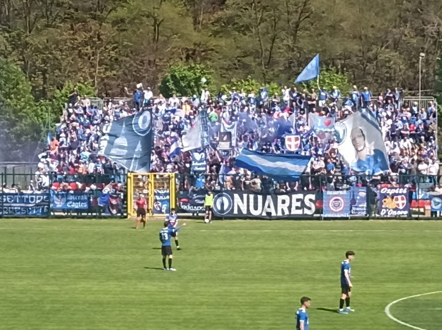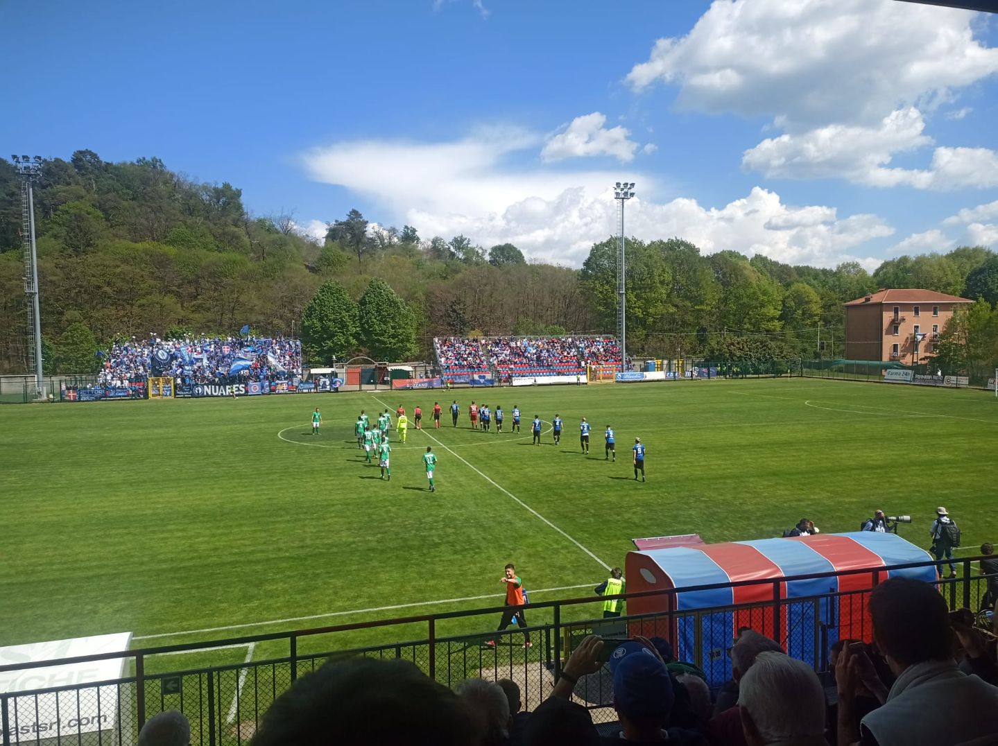 GOZZANO – 01-05-2022 -- Arriva sul Cusio la promozione matematica del Novara Fc in Serie C. Pur non riuscendo a conquistare i tre punti che sarebbero serviti allo scopo senza stare a guardare il risultato della Sanremese, gli azzurri hanno approfittato della rete di Parlanti del Sestri Levante al terzo minuto di recupero che ha costretto al pari i rivali del Novara nella corsa alla categoria superiore. Lo 0-0 maturato in un D’Albertas quasi completamente esaurito ed invaso da striscioni e bandiere degli ultras novaresi, non ha dunque impedito la festa finale. Veniamo alla cronaca. Si vede per primo il Gozzano, all’8° Bane ci prova di testa ma la difesa libera. Due minuti dopo una punizione di Cozzari termina a lato di parecchio. All’11° Pagliai serve Vuthaj in area cusiana, Vagge si salva in corner. Al 15° l’angolo è per il Gozzano ma Cozzari di testa mette a lato. Al 20° è Costanzo a mettere in mezzo e la difesa del Novara a salvarsi in corner. Al 28° Cozzari serve Montesano che si vede ribattere la conclusione. Il Novara si fa vedere a sua volta in varie occasioni in area rossoblù, ma senza costruire nulla di pericoloso. Al 30° la palla gol del Gozzano: Castelletto smarca Pennati a due metri dalla linea di porta con Desjardins battuto, ma l’attaccante controlla male e spara alto sulla traversa. Due minuti e Gonzalez al volo appena fuori area calcia verso la porta, ne esce solo un corner. Un altro minuto ed è Vuthaj a mettere fuori di testa da due passi. La vera occasione per il Novara è al 35°: Vaccari lancia in velocità Gonzalez che entra in area e batte quasi a colpo sicuro, ma Vagge si supera e ci arriva di piede. Si passa al secondo tempo. Al 51° Vuthaj calcia dal limite e colpisce l’incrocio dei pali. Al 54° Castelletto di testa, para facilmente Desjardins che si ripete due minuti dopo su una conclusione di Costanzo. Non succede più nulla di significativo fino al 76° quando il Novara inizia a premere con decisione stimolato dalle notizie che danno la Sanremese in vantaggio 2-1 col Sestri Levante. Calcia ancora Vuthaj da un metro ma Montesano salva sulla linea spedendo in corner. Ci prova Tentoni al 79°, servito da Laaribi, ma il tiro è debole. L’ultima occasione all’inizio del recupero è del Gozzano: Cozzari viene atterrato al limite da Benassi, punizione di Montesano che impegna Desjardins costringendolo alla deviazione in angolo. Al triplice fischio dell’arbitro, signor Rispoli di Locri che ha molto ben diretto, le squadre rientrano negli spogliatoi, ma nemmeno due minuti dopo arriva la notizia delle rete di Parlanti a Sanremo e tutto il Novara si riversa nuovamente in campo e inizia la festa delle centinaia di sostenitori che gremivano le gradinate. (FAB)